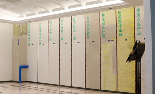 建筑大白鏟除→墻固整體涂刷→特殊墻面處理→石膏滿刮找平→膩?zhàn)优我槐?rarr;膩?zhàn)优味?rarr;墻面砂光打磨→乳膠漆滾涂第一遍→乳膠漆滾涂第二遍